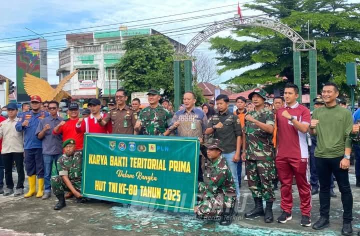 Filesatu.co.id, BATURAJA | DALAM rangka bakti teritorial HUT TNI ke-80, jajaran TNI bersama unsur Forkopimda Kabupaten Ogan Komering Ulu (OKU) melaksanakan karya bhakti berupa pembersihan fasilitas umum pada Kamis (18/9/2025) pagi.