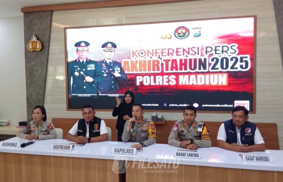 Filesatu.co.id, Madiun | Kepolisian Resor (Polres) Kabupaten Madiun menggelar Press Release Akhir Tahun 2025 yang dipimpin langsung oleh Kapolres Kabupaten Madiun AKBP Kemas Indra Natanegara, S.H., S.I.K., M.Si., didampingi Kasi Humas IPTU Anita Diah Puspitosari, S.H.