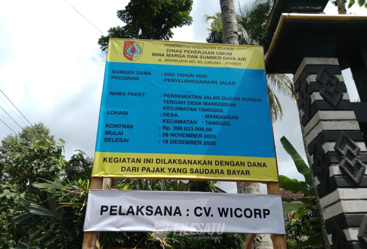 Filesatu.co.id, Jember | Pembangunan jalan dusun Sungai Tengah desa Manggisan Kecamatan Tanggul yang bersumber dari APBD Jember TA 2025 senilai Rp.399.623.000,- dengan waktu pelaksanaan kurang lebih 45 (empat puluh lima) hari kalender oleh CV. Wicorp Jember, disorot warga, Selasa, (6/01/ 2026).