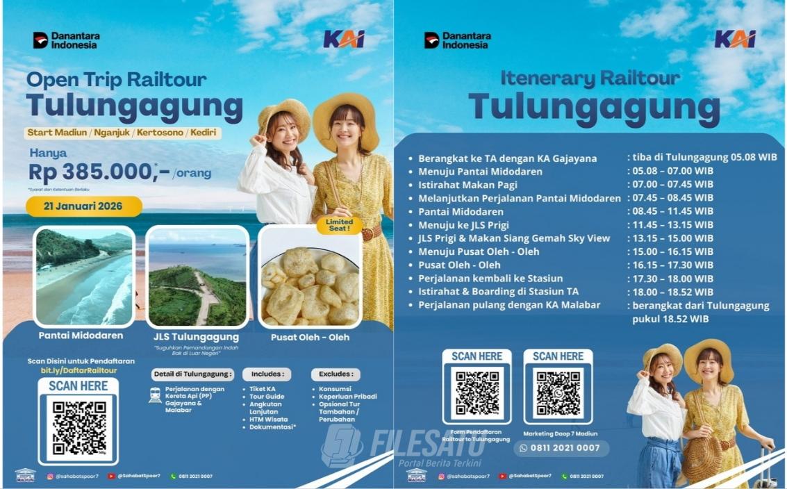 Filesatu.co.id, Madiun | PT Kereta Api Indonesia (Persero) Daerah Operasi 7 Madiun menegaskan perannya tidak hanya sebagai penyedia transportasi, tetapi juga penggerak ekonomi daerah melalui program pariwisata tematik “Rail Tour Jawa Timur” yang telah berjalan sejak 30 Oktober 2025.