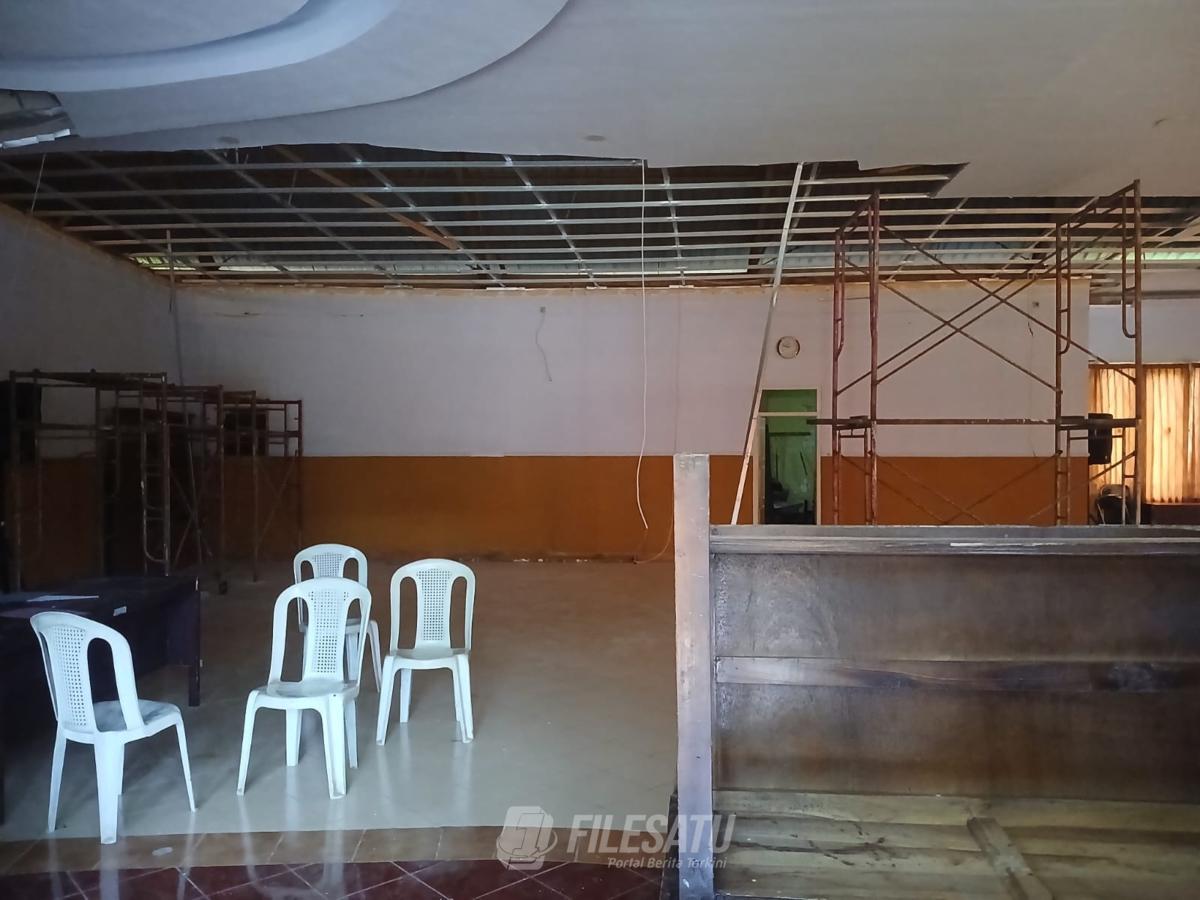Berdasarkan pantauan di lokasi pada Selasa (28/4/2026) siang, kerusakan plafon terlihat jelas di beberapa titik aula. Saat itu tidak ada aktivitas perbaikan. Tumpukan material bangunan juga masih terlihat di sekitar area aula.