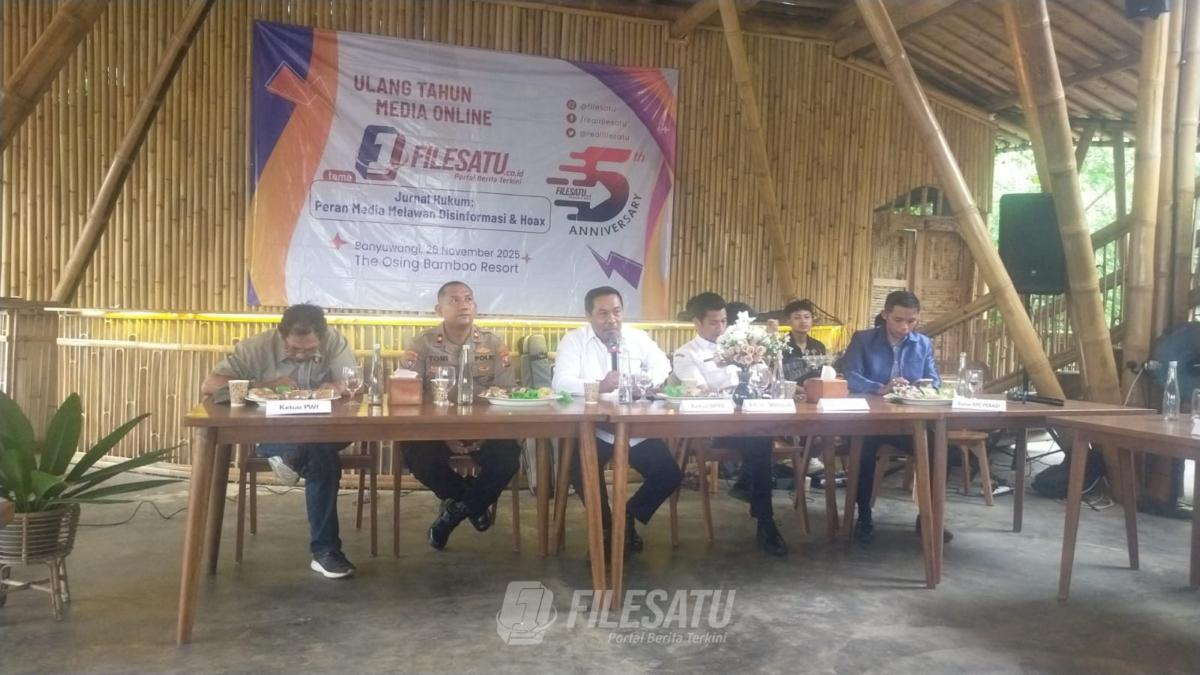 Filesatu.co.id, Banyuwangi |  Media online Filesatu.co.id merayakan hari ulang tahunnya yang ke-5 dengan menggelar diskusi hukum di The Osing Bamboo Resort Banyuwangi. Perayaan tersebut dikemas dalam forum diskusi bertema “Peran Media Melawan Disinformasi dan Hoaks”.