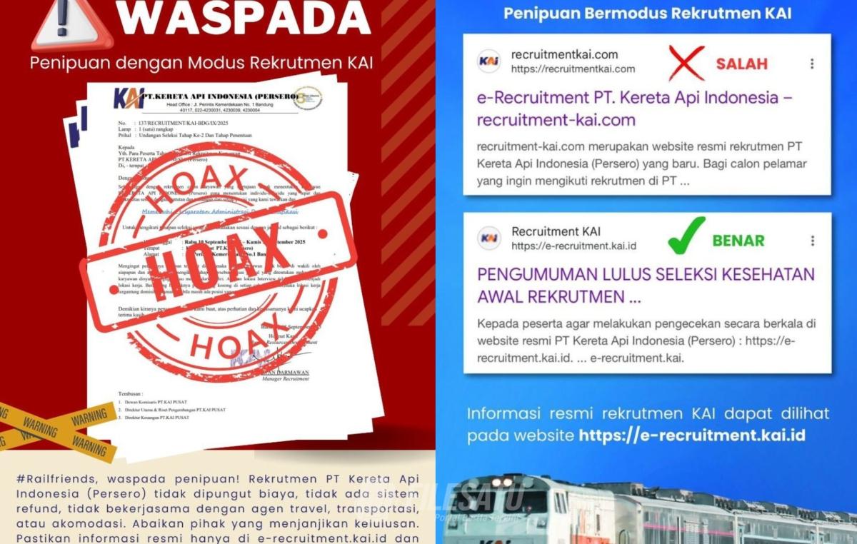 Filesatu.co.id, Madiun | PT Kereta Api Indonesia (Persero) telah menutup proses rekrutmen resmi KAI pada 3 September 2025 lalu. Namun, baru-baru ini ditemukan situs dan akun palsu yang menyebarkan lowongan kerja fiktif. Untuk itu, KAI Daop 7 Madiun mengimbau masyarakat untuk lebih waspada terhadap penipuan berkedok rekrutmen pegawai yang mengatasnamakan KAI.