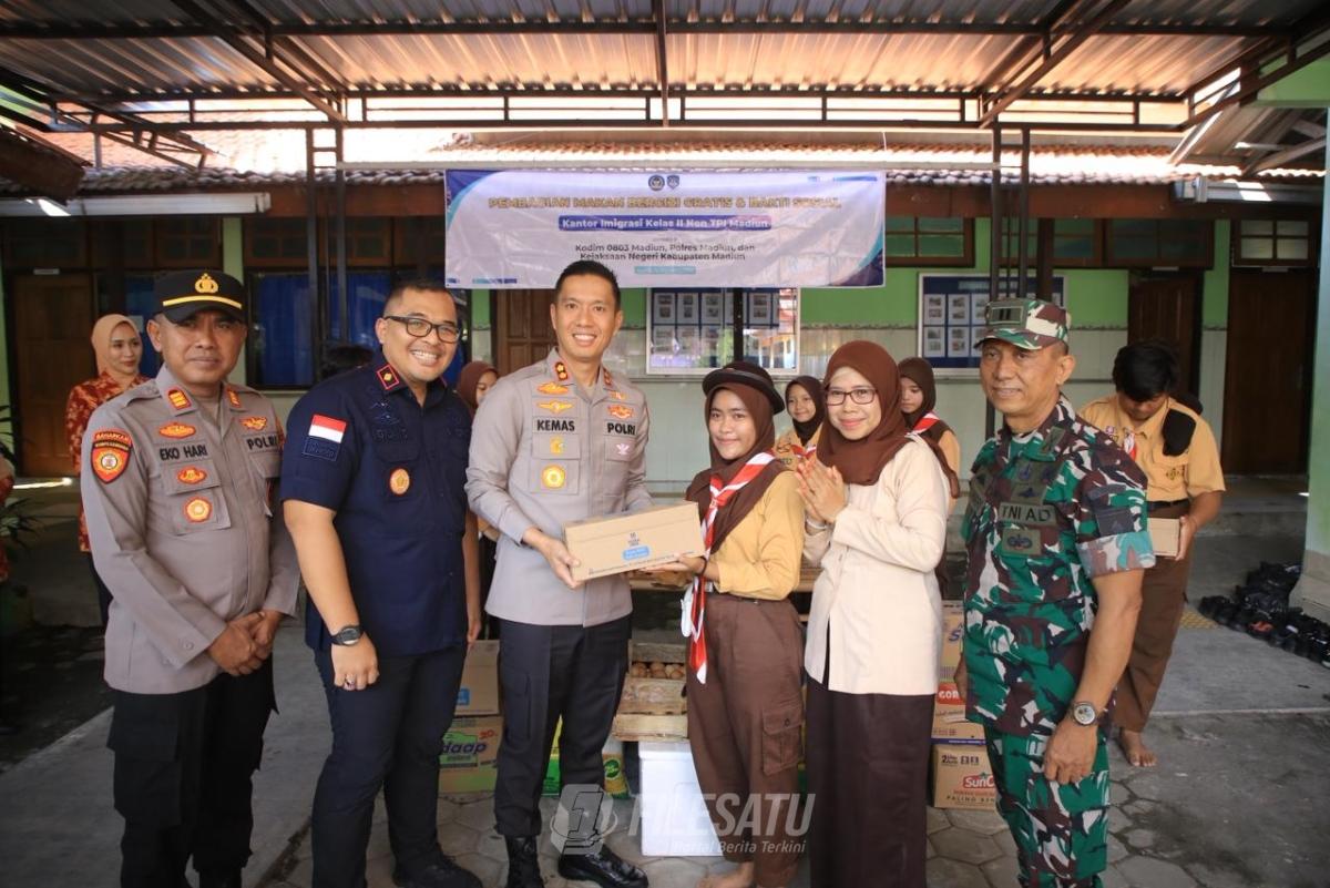 Filesatu.co.id, Madiun | Kapolres Madiun AKBP Kemas Indra Natanegara, S.H., S.I.K., M.Si bersama jajaran Kantor Imigrasi Madiun melaksanakan kegiatan sosial berupa penyaluran bantuan sosial (bansos) dan program Makan Bergizi Gratis (MBG) di Sekolah Luar Biasa Negeri (SLBN) Banjarsari Wetan, Kamis (14/8/2025).