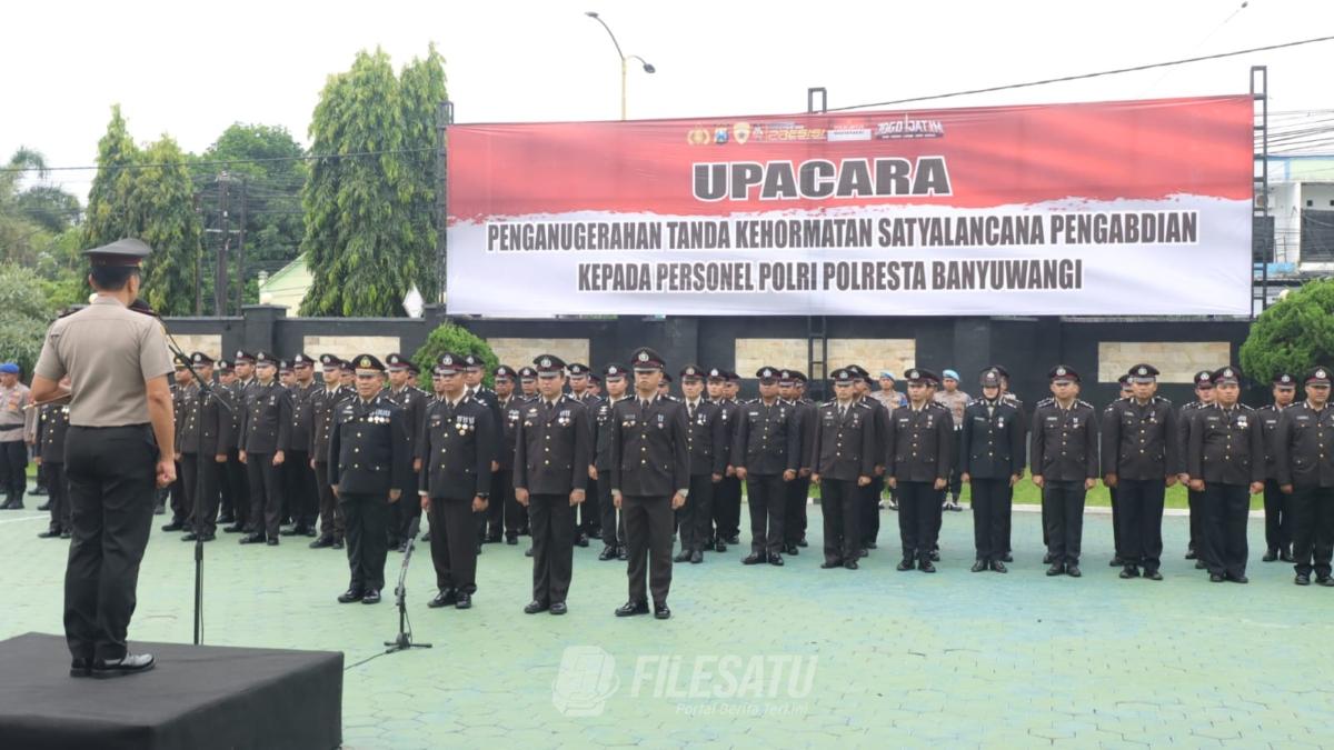 Sebanyak 72 personel Polresta Banyuwangi menerima Tanda Kehormatan Satyalancana Pengabdian, dengan rincian 5 personel masa dinas 32 tahun, 25 personel masa dinas 24 tahun, 13 personel masa dinas 16 tahun, dan 29 personel masa dinas 8 tahun.