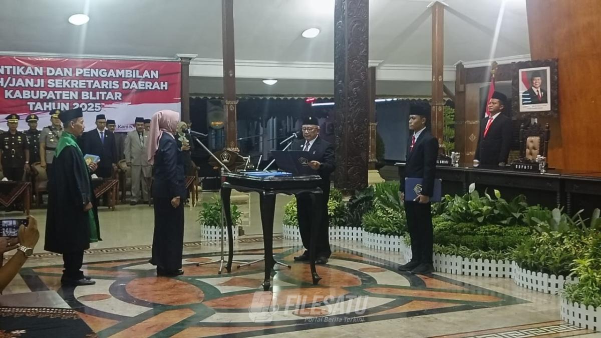 Filesatu.co.id, Blitar | Khusna Lindarti, yang sebelumnya menjabat sebagai Staf Ahli Bagian Ekonomi dan Pembangunan Setda Pemerintah Kabupaten Blitar sekaligus Pelaksana Jabatan Sekretaris Daerah (Pj. Sekda), di hadapan Bupati Blitar Drs. H. Rijanto, ratusan pasang mata menyaksikan sumpah jabatan Khusna Lindarti sebagai Sekretaris Daerah (Sekda) definitif kabupaten Blitar.