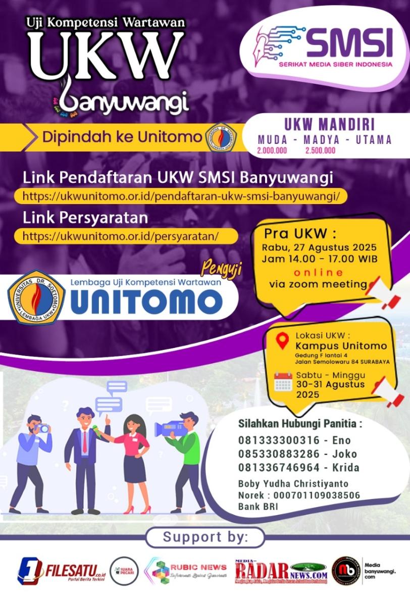 Filesatu.co.id, Banyuwangi | Penyelanggaraan Uji Kompetensi Wartawan (UKW) jenjang Muda, Madya dan Utama semula rencana digelar di Banyuwangi pada tanggal 5-6 Agustus oleh organisasi Media Siber Indonesia (SMSI) Banyuwangi, mengingat kondisi kuota kurang mencukupi akhirnya diundur dan berubah tanggal menjadi 30-31 Agustus 2025 dan pindah tempat di Surabaya bergabung UKW yang digelar lembaga uji Untomo.