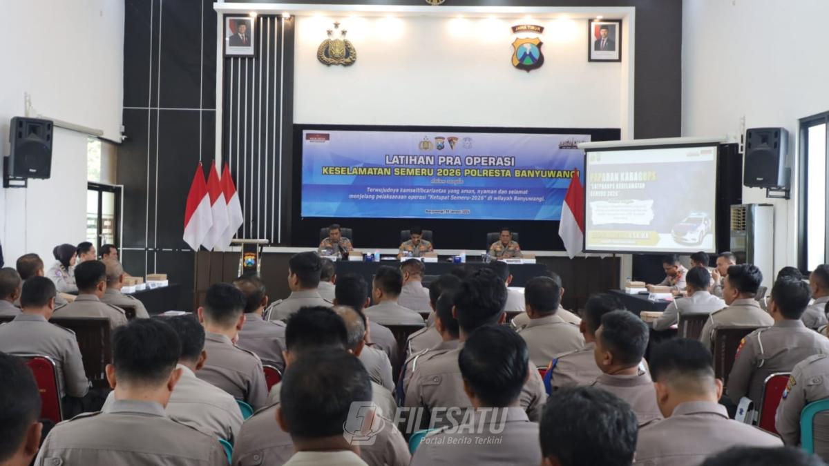 Filesatu.co.id, Banyuwangi | Dalam rangka memantapkan kesiapan personel menjelang pelaksanaan Operasi Keselamatan Semeru 2026, Polresta Banyuwangi menggelar Latihan Pra Operasi (Latpraops) yang dipimpin langsung oleh Kapolresta Banyuwangi Kombes Pol. Dr. Rofiq Ripto Himawan, S.I.K., S.H., M.H., Rabu (28/01/2026), bertempat di Rupatama Mapolresta Banyuwangi.