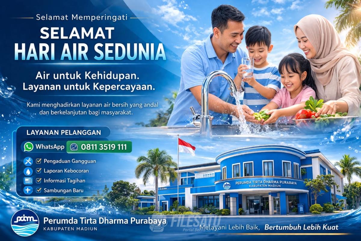 Filesatu.co.id, Madiun | Perusahaan Daerah Air Minum (PDAM) Tirta Dharma Purabaya Kabupaten Madiun memperingati Hari Air Sedunia yang jatuh pada 22 Maret 2026 dengan menegaskan komitmen dalam penyediaan layanan air bersih bagi masyarakat.