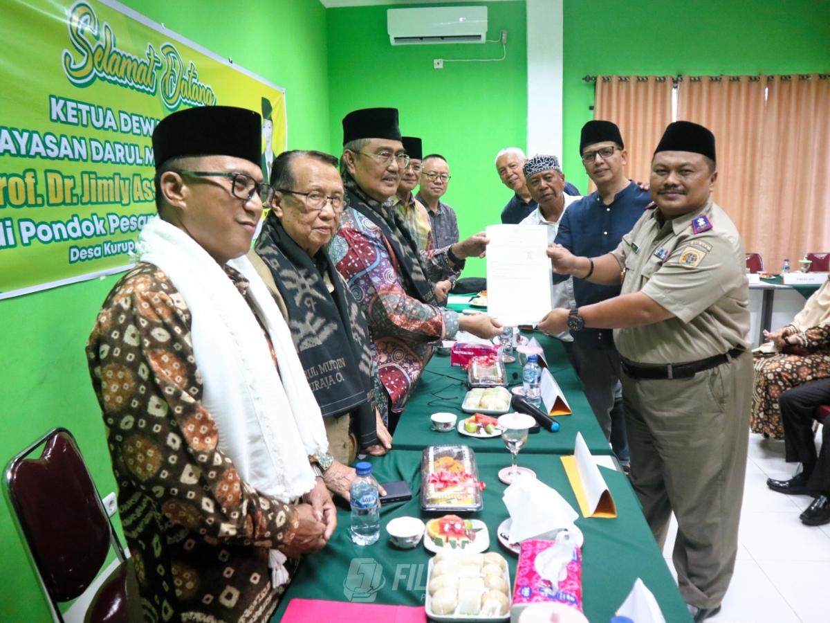 Filesatu, co, id, Baturaja | Kantor Pertanahan Kabupaten Ogan Komering Ulu (OKU) menyerahkan sertipikat tanah wakaf kepada Yayasan Pondok Pesantren Darul Muttaqin Baturaja, Senin (25/08/2025). Sertipikat wakaf seluas 390.869 meter persegi tersebut diserahkan langsung oleh Kepala Kantor Pertanahan Kabupaten OKU, Bapak Ribut Setiawan, S.H., kepada Prof. Dr. H. Jimly Asshiddiqie, S.H., M.H. selaku Ketua Dewan Pembina Yayasan Darul Muttaqin.