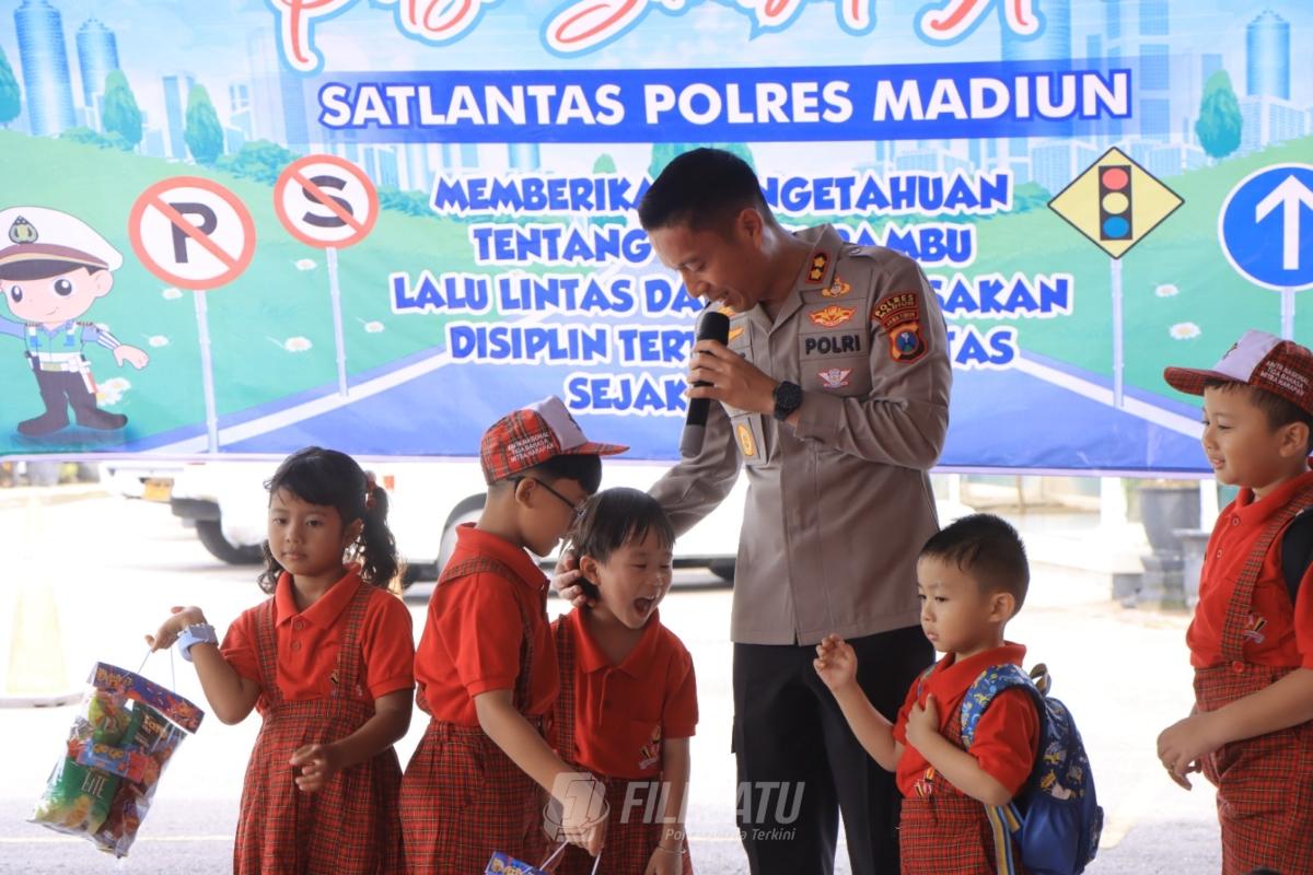 Kapolres Madiun dalam kesempatan tersebut menyampaikan bahwa kegiatan Polisi Sahabat Anak merupakan salah satu upaya Polri untuk membangun kedekatan dengan generasi muda sekaligus memberikan edukasi tentang keselamatan berlalu lintas sejak dini.