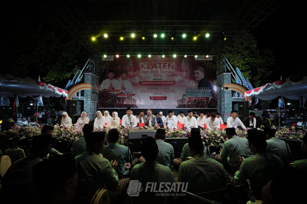 Filesatu.co.id, Klaten | Pemerintah Kabupaten (Pemkab) Klaten kembali menggelar Klaten Berdzikir dan Bersholawat (KBBS) di Alun-alun Klaten, Sabtu (2/8/2025) malam bersama Sayyid Zulfikar as Syaibani, mubaligh dan qori’ asal Jawa Timur. Kegiatan tersebut digelar sebagai rangkaian Hari Jadi ke-221 Klaten dan menyambut HUT ke-80 Republik Indonesia.