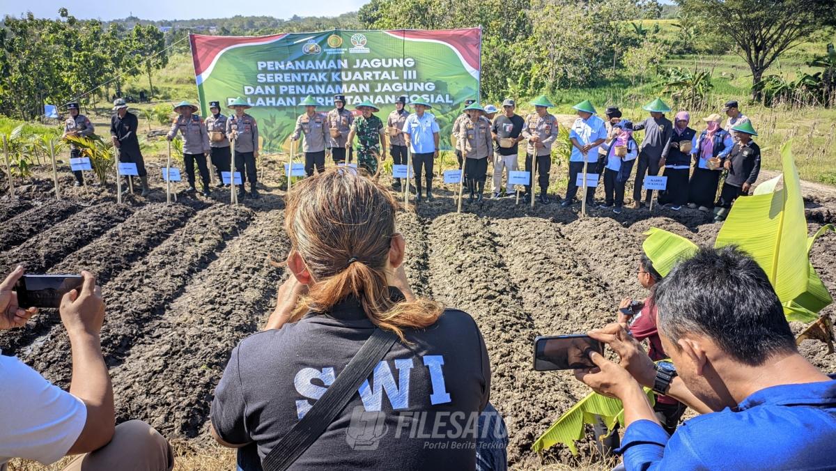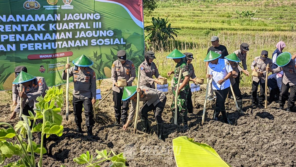 Filesatu.co.id, Madiun | Kapolres Madiun AKBP Kemas Indra Natanegara, S.H., S.Ik., M.Si. memimpin kegiatan penanaman jagung secara serentak dalam rangka mendukung program ketahanan pangan nasional. Kegiatan ini dilaksanakan di lahan pertanian Desa Sukosari, Kecamatan Dagangan, Kabupaten Madiun, sebagai wujud sinergitas Polri bersama masyarakat dalam mewujudkan swasembada pangan, Rabu (9/7/2025).