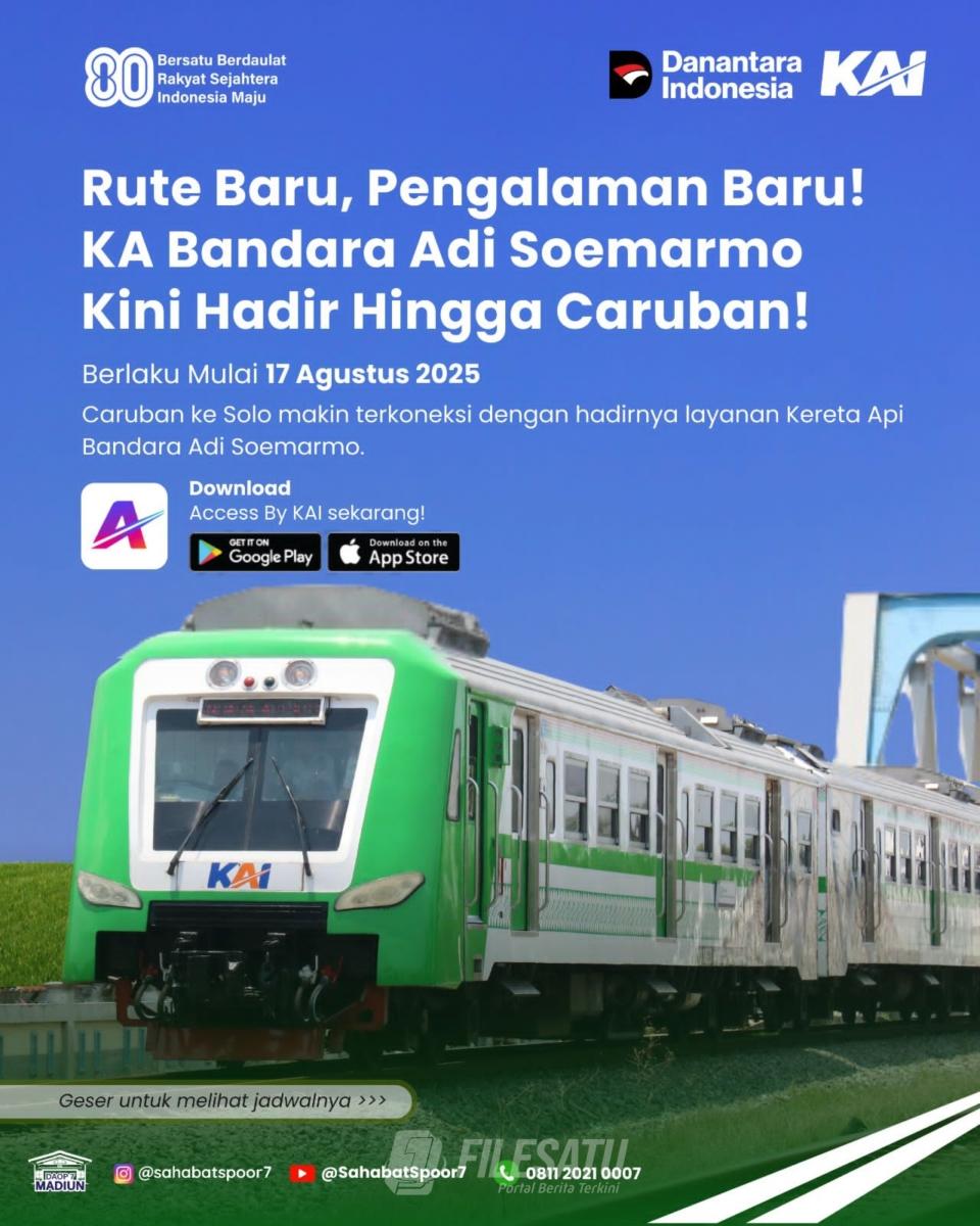 Filesatu.co.id, Madiun | Bertepatan dengan HUT ke-80 Republik Indonesia, PT Kereta Api Indonesia (Persero) Daop 7 Madiun akan memperpanjang rute KA Bandara Internasional Adi Soemarmo (BIAS) hingga Stasiun Caruban, Kabupaten Madiun. Perpanjangan ini bertujuan untuk meningkatkan aksesibilitas dan kemudahan mobilitas masyarakat di wilayah Caruban dan sekitarnya.